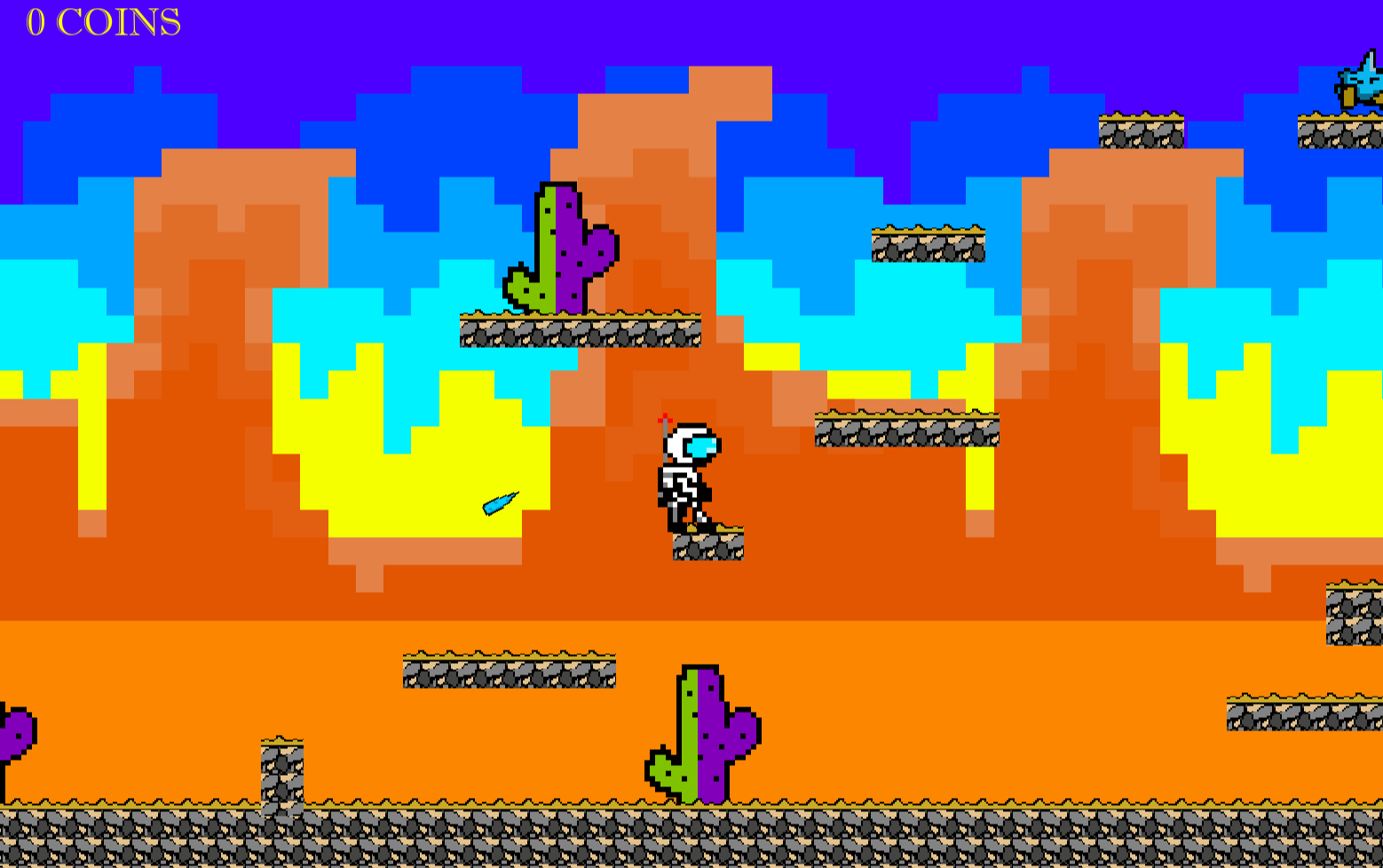 Use left and right arrow keys to move around, and up arrow or space bar to jump in the air. Don't touch the purple part of the cacti, but you can touch the green part. Stomp on bunnies to not kill them, but instead send into pods in the air. They are innocent and fell under the evil spell of the weather wand cast by Bunny Lord. But, you should kill the ferocious fire and ice minions that roam Mars by the same way you'd save the bunnies. However, they do shoot fireballs and icicles, so watch out! That is all.