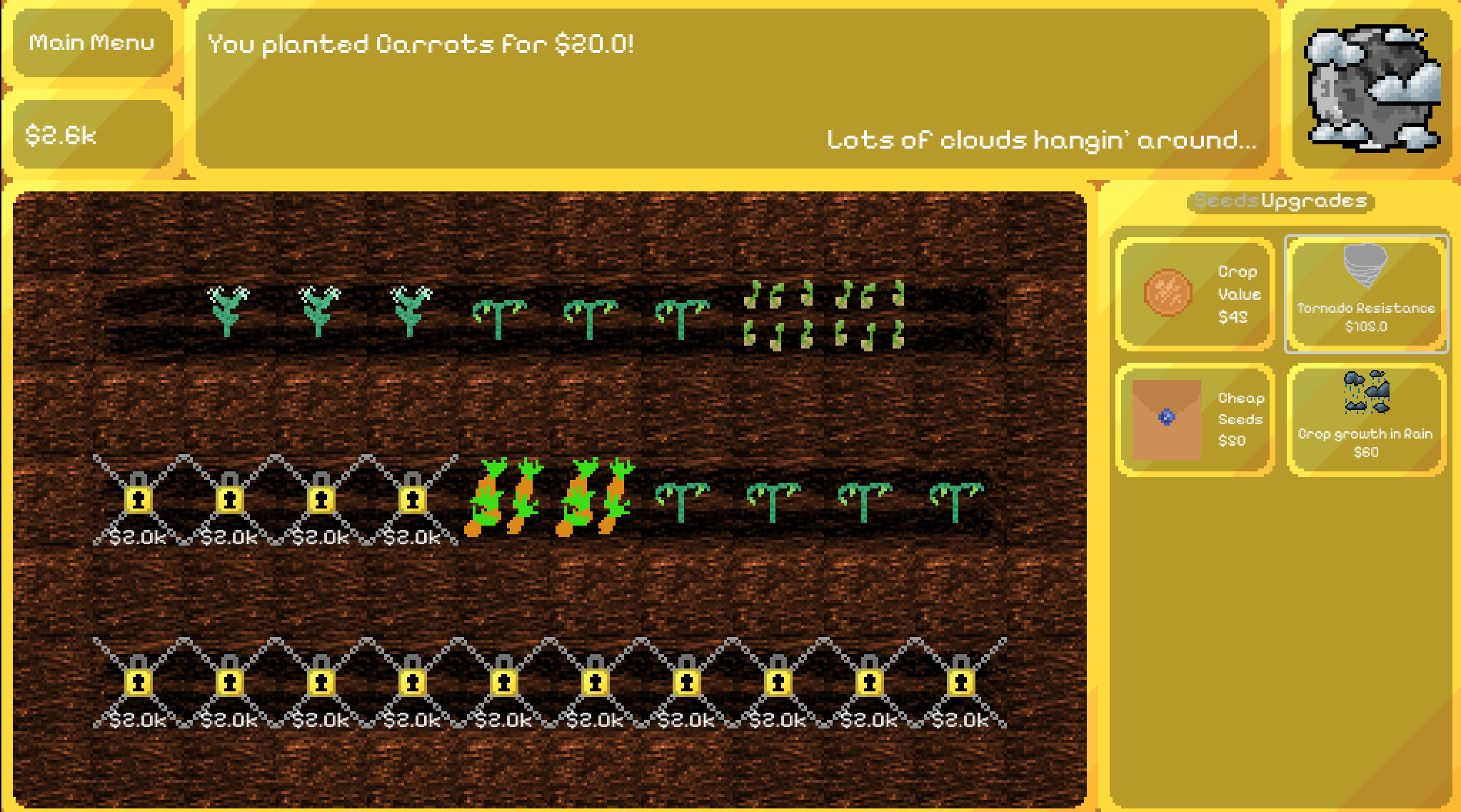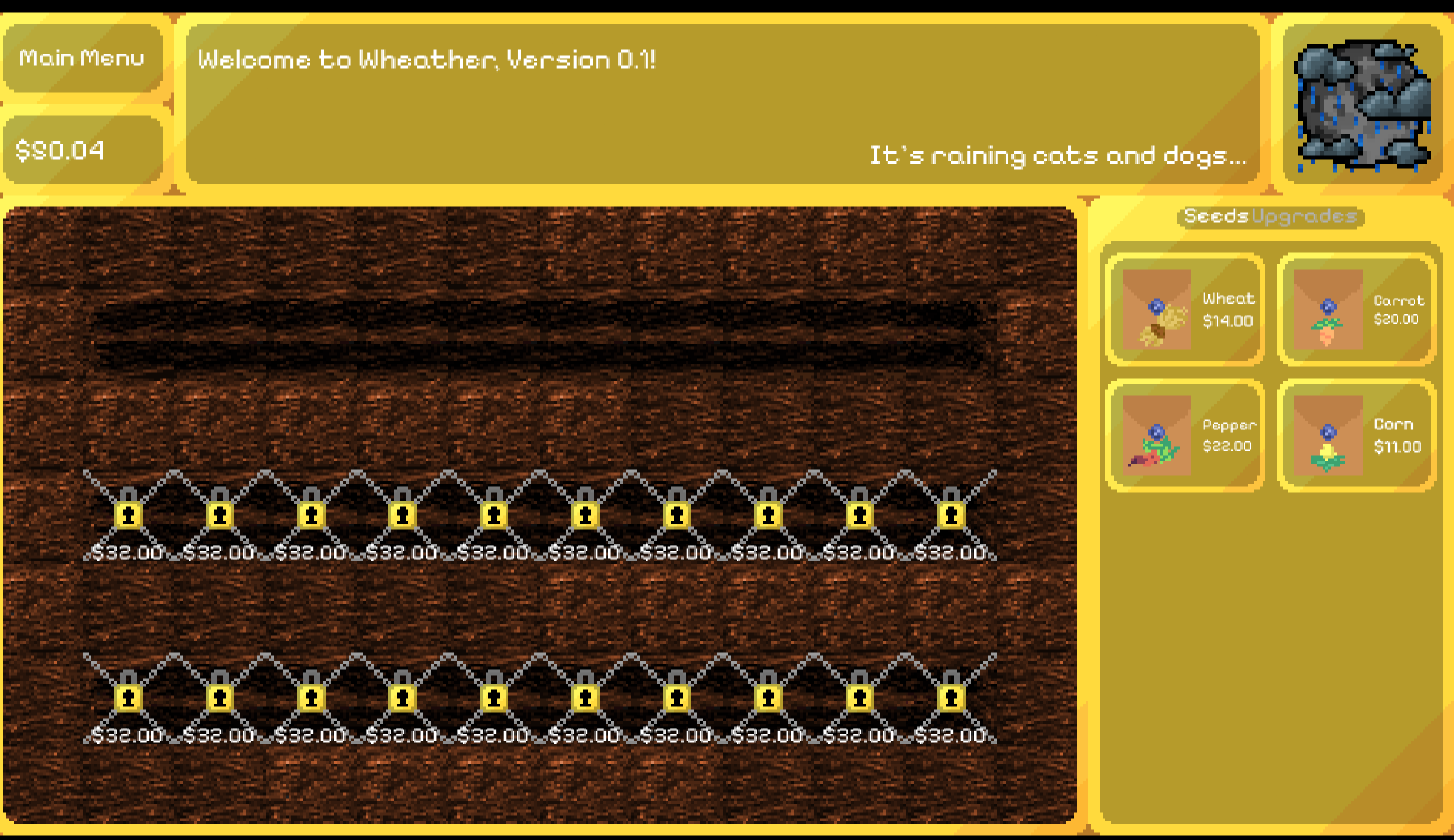 Playing wheather is very simple! All you need to do is run the game and hit play, then you can start farming. You can click on a crop and then a farm tile to plant and spend money. If you would like to buy a farm tile you can click on it. To upgrade plant resistance or profitability click over to upgrades, select your plant, and buy the upgrade you want!