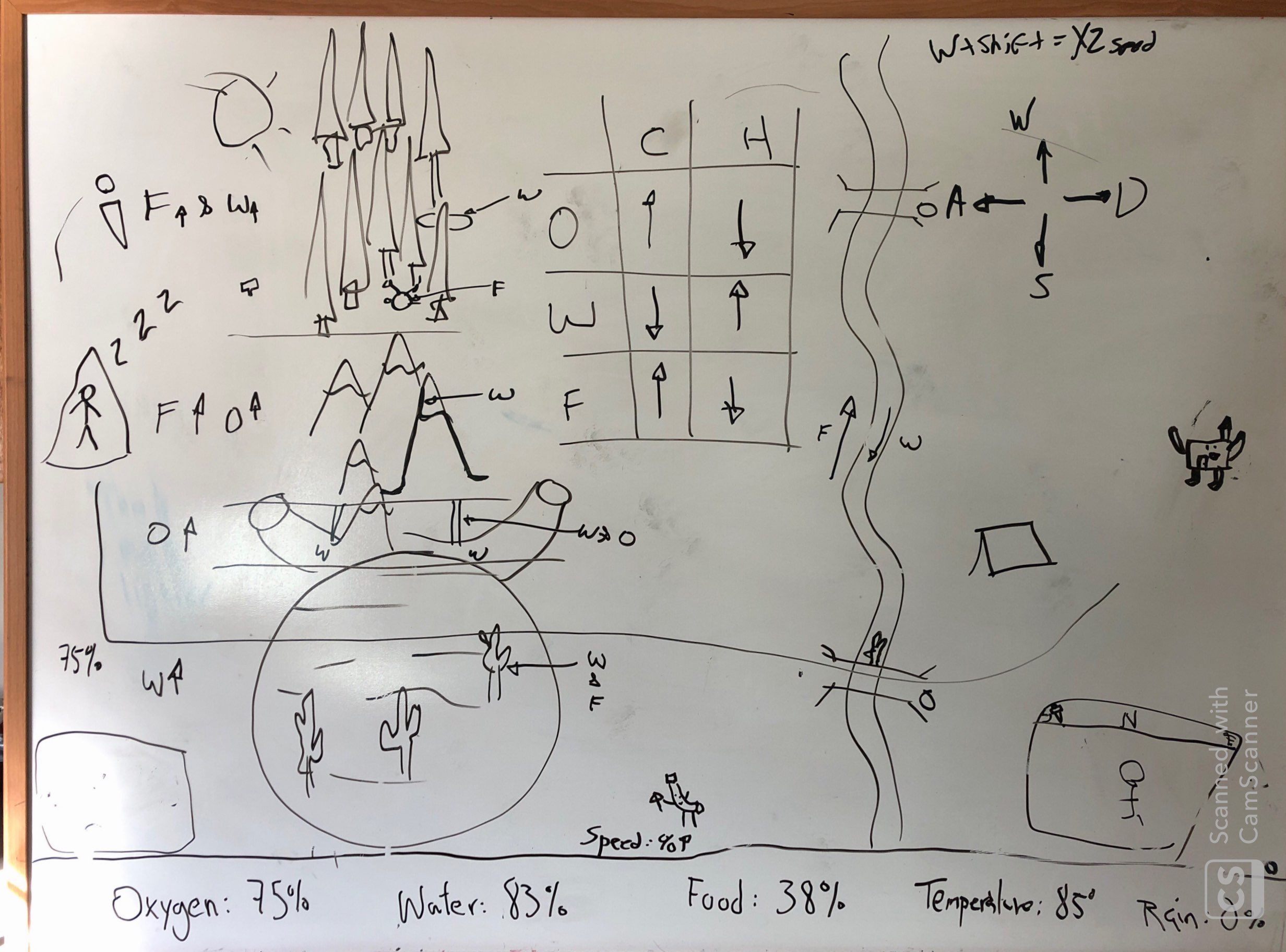 Our game is based on outer space scarcity theme were you are trying to survive in space for 3 minutes, it seems like an easy task right? Well think again. You are trying to dodge asteroids that constantly spawn around you, if you get hit by one, one of your resources will start going down faster, and that might make the game harder so we added an energy shield that destroys everything around you including the resources you need , you have oxygen, water and energy. During the game you will need to collect these assets to restore them and keep surviving. There is also a bonus, it is the "repair" basically it just fixes everything you had wrong. If you lose all of your water you will be very slow, if you loose all of your energy you will no longer be able to activate your energy shield, if you run out of oxygen well, Game Over because without oxygen well you suffocate. Ay, ay. ay!